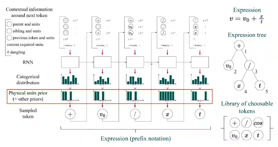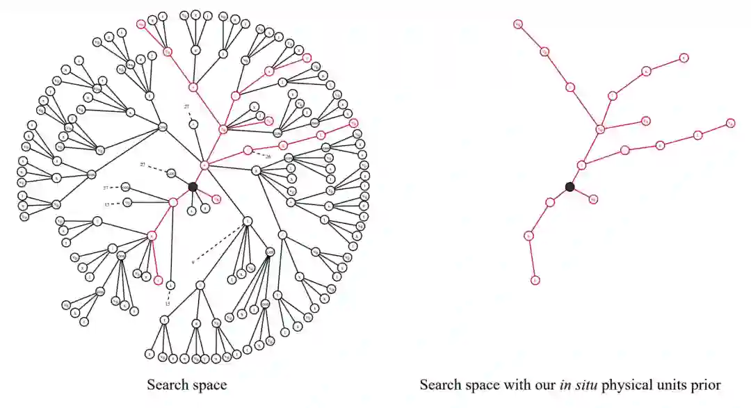 Wassim Tenachi, et al. Deep symbolic regression for physics guided by units constraints: toward the automated discovery of physical laws. arXiv:2303.03192. 物理学领域也应用了深度符号回归方法。这些方法引入物理量纲约束,要求得到的方程必须在物理量纲方面保持平衡。这种方法已经用于发现爱因斯坦的质能方程等已知物理规律。 图:搜索空间