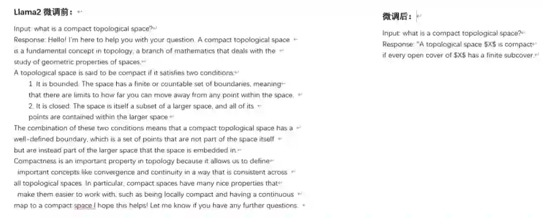 在以上基本组件中,语言大模型是一个基础设施,其他组件作为插件部署并被调用。数学家可以借助该平台,通过自然语言与计算机进行交互,实现对数学命题更高效的发现,证明或证否。 经过几个月的努力,DeepMath 研究团队近日发布了 DeepMath 数学大模型,并正在构建人机交互的现代数学研究平台。模型已上传到 Huggingface,感兴趣的朋友可以登录 www.deepmath.cn 通过邀请码注册,在线体验实际效果。 DeepMath 大模型的特点: DeepMath 大模型基于 Llama2 微调,显著提升了大模型在现代数学知识问答的能力。为了验证模型效果,我们在线问了一个拓扑学问题:what is a compact topological space? 得到的答案是:A topological space X is compact if every open cover of X has a finite subcover. 回答相当准确! 而如果使用原始 Llama2,会得到怎样的回复呢? 可以参考如下测试结果的截图: