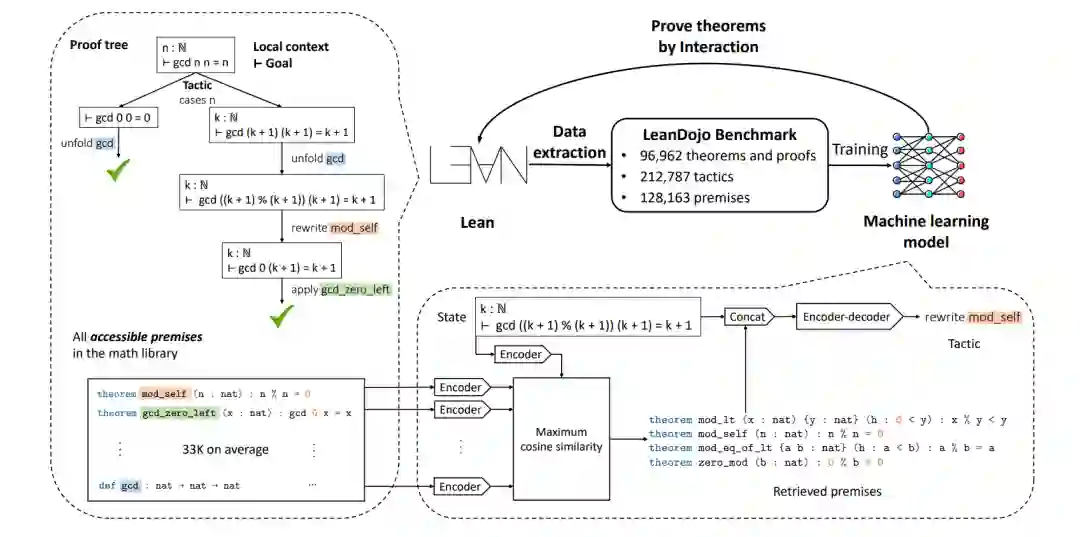 近期人工智能大模型成为最热门的话题之一。作为语言大模型最具影响力的产品,ChatGPT引发了一场新的产业革命。 大语言模型的训练路线如下:语言模型预训练 → 有监督指令微调 → 奖励模型训练 → 强化学习大语言模型的思维链推理Jason Wei, et al. Chain-of-Thought Prompting Elicits Reasoning in Large Language Models. arXiv:2201.11903 [cs.CL] 形式化的自动定理证明Kaiyu Yang et al. LeanDojo: Theorem Proving with Retrieval-Augmented Language Models. arXiv:2306.15626 这篇论文用大模型跟另外一套形式化的语言Lean去进行交互。Lean是一种形式化的语言,它将数学语言转化成计算机语言,然后在这个语言框架下去进行严格的推理。所以可以确保它的推理准确性比大模型要高。微软开发了Lean这个库,把很多数学知识变成了这种语言,涵盖上至本科数学的知识。LeanDojo基于已有的库,把计算机语言还原成自然语言,利用思维链 (chain-of-thought) 推理,把证明过程放到大模型里去训练,然后做微调,以提升大模型的能力。