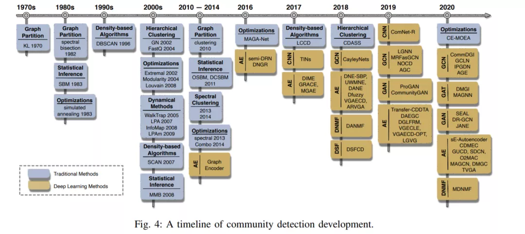 社区检测在网络分析和数据挖掘中具有重要意义。图4展示了传统学习方法和深度学习方法的发展。传统的方法是在网络结构上探索社区。这七种方法(图3左图)仅以一种简单的方式捕捉浅连接。传统方法的检测结果往往是次优的。我们将在本节简要回顾它们的代表性方法。深度学习方法(图3右图)揭示了深度网络信息,复杂关系,处理高维数据。