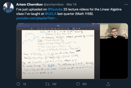 视频提供了详细的课堂笔记,但是没有字幕。 近日,UCLA 教授 Artem Chernikov 宣布自己的线性代数课程 UCLA MATH 115B 全部内容已在 YouTube 平台公开。