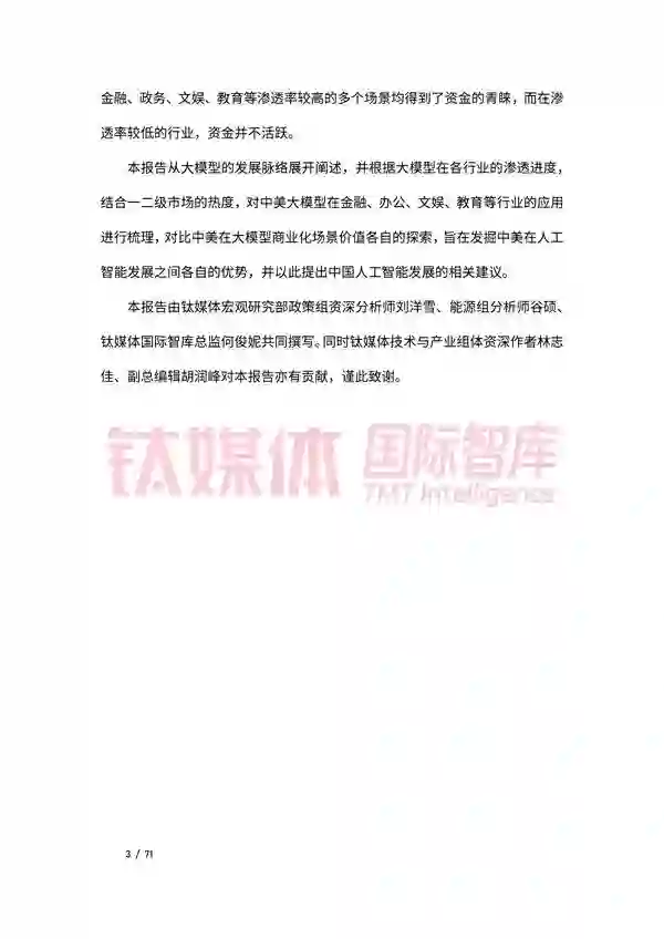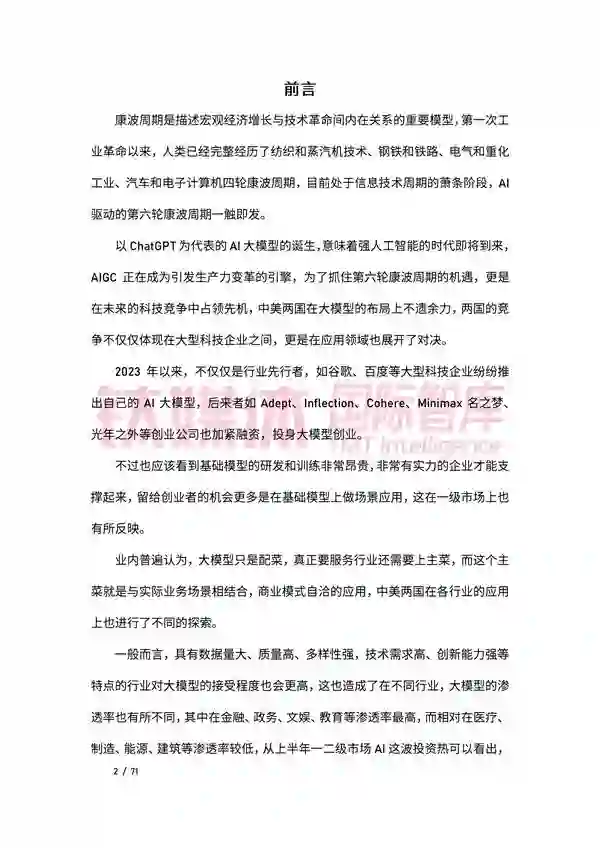 通过对2023年以来中美在这六大行业的大模型应用重点案例的收集、梳理和分析,全景式展现了中美在AI大模型应用领域现状、以及各自的特点、优劣势比较与分析,并以此提出对中国人工智能发展的相关建议。 ** 大模型成中美科技竞争新阵地**