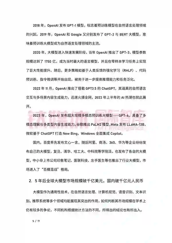 报告认为,目前,中美在AI大模型方向领先世界各国,然而二者的竞争也已经明牌,中美两国在AI大模型各方面的表现各有胜负,其中以谷歌为代表的科技巨头长期投身于基础理论的研究,使得美国引领者人工智能的发展潮流,依托浓厚的工程师文化,美国在基础大模型上保持领先优势。在一级市场上,美国对大模型的投资也比较积极,其中以英伟达、微软、S Salesforce等为代表的科技巨头成为美国AI领域最重要的“独角兽猎手”,在一级市场的大手笔投入,为美国人工智能的发展积蓄了力量。 此外,美国各个行业整体的信息化水平较高,积累了丰富的结构化数据,这为美国做大模型落地打下了基础。尤其是在医疗研发等方向,其会继续保持着先发优势。 相比美国,国内一直扮演着追随者的角色,在基础模型方面,中美之间的差距并不大,“重应用轻基础”的研发理念,以及国内庞大的下游需求,让国内机构更加专注于落地应用的研究,可以说,在AI大模型的应用上,国内是更胜一筹的。 一方面是,国内一级市场更多是关于大模型应用的创业项目,另一方面,各行业较成熟的企业,例如教育行业的好未来,办公软件行业的金山办公,医疗行业的医云科技等等,均依托在各自行业的深耕,或外接基础模型,或利用开源模型自研模型来使所从事的行业用上AI大模型。 不过,也应该注意到,国内不少行业尚未完成信息化,基础数据的匮乏使得AI大模型在某些行业寸步难行,此外,算力制约成为中美AI竞争的一把利刃,努力冲破算力制约是AI发展路上的头等大事。 ** 大模型进入“百模混战”时代**