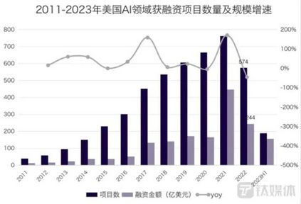 根据Crunchbase数据库,2011-2023年共计3658个AI领域融资项目(仅统计500万以上融资金额的项目,且融资公司所在地为美国),美国AI领域融资项目数及融资金额稳步增长。2022年美国风投AI领域融资项目数为574个,2011-2022年CAGR达29.3%;2022年美国AI领域融资金额为243.5亿美元,2011-2022年CAGR达422.5%。