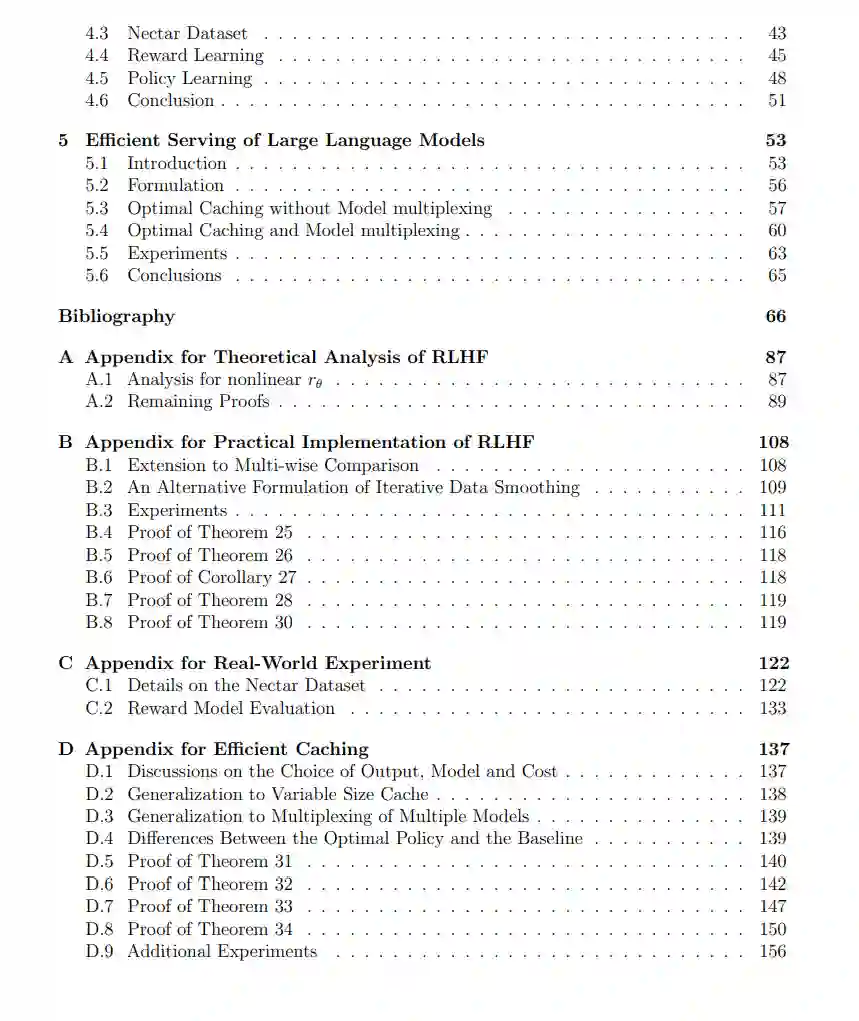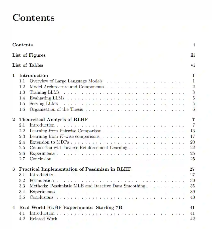 本论文主要解决了大型语言模型(LLMs)中的两个基础性挑战:通过RLHF进行后训练和通过接近最优的缓存策略优化推理效率。论文结构从理论基础到实际实现,最终通过实际验证进行总结。 论文的剩余部分组织如下: * 第2章(RLHF的理论分析):提供了一个严格的数学框架,分析RLHF的收敛性和通过偏好优化对齐能力。 * 第3章(RLHF的实际实现):引入了基于悲观主义的RLHF算法,以解决奖励过度优化问题,并通过Starling-7B案例研究进行了实验验证,展示了改进的伦理对齐效果。 * 第4章(真实世界的RLHF实验:Starling-7B):进行了一项真实世界的RLHF实验,首先收集7项比较数据,训练奖励模型,并使用提出的RLHF算法微调现有语言模型。 * 第5章(高效的LLM服务):开发了最优缓存策略来调度推理任务,将LRU/LFU基础算法与新的成本感知算法结合,适应LLM特定的计算模式。