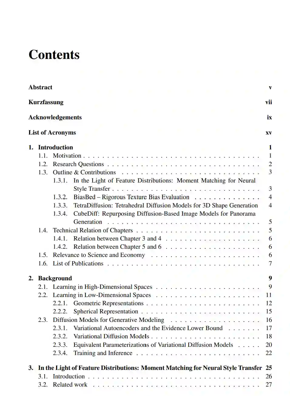 深度神经网络在学习丰富且结构化的潜在表征方面展现出强大能力,这推动了计算机视觉及更广泛领域的显著进展。它们在图像分类、语义分割、自然语言处理和生成建模等任务中均取得了卓越的成果。其表达能力的关键因素在于对海量数据的训练,使模型能够捕捉复杂模式并实现跨任务的泛化。然而,当数据稀缺或难以获取时,这种对大规模数据集的依赖便成为显著的限制。由此,一个自然的问题随之产生:如何在缺乏大规模配对数据的场景下,利用并适配那些在数据丰富领域中学到的表征?对此,通常有两类通用方法:其一是分析并变换潜在特征空间,使其与新的目标对齐;其二是直接适配和操作输入空间,以更好地契合模型已学习的先验。 本论文在表征学习与生成建模的语境下探讨了这两类策略。对于第一类方法,我们将神经网络中的编码信息视为结构化的特征分布,并通过数学上有根基的技术实现这些分布的对齐。在神经风格迁移的场景中,我们首先基于该思路提出了一种理论基础上的特征对齐方法。与现有方法相比,该方法能够实现更一致的风格迁移,并且具备理论保证。此外,我们还通过建立一个严谨的框架来识别和评估学习到的表征,加深了对潜在空间的理解,特别是在深度学习模型的纹理偏差问题上,对现有解决方案的有效性提出了部分质疑。 第二类方法则聚焦于适配数据表征本身,既包括对输入域的变换,也包括对模型架构的修改。这在传统架构难以处理的领域尤为重要,例如缺乏规则或高效网格结构的场景。在本论文中,我们重点研究了针对三维和非欧几里得数据的生成建模。为此,我们提出了一种基于扩散的生成模型,利用四面体表征实现高质量的三维形状合成,同时保持几何一致性。与现有方法相比,该方法能够在前所未有的分辨率下生成三维网格,并兼顾计算效率。最后,我们提出了一种方法,将现有扩散模型扩展至全景图像生成的任务,同时保留其互联网规模的图像先验。该模型不仅提升了图像质量,还实现了比已有工作更强的生成可控性。 总而言之,这些研究成果表明,通过理解并适配现有模型及表征,可以将深度学习拓展至新的输入与输出域。这些原则具有普适性,并能应用于广泛的计算机视觉任务。