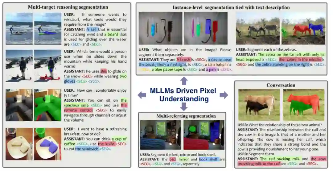 用于指代分割的扩散特征。在有条件的文本指导下,模态交织的注意力图(参见§3.2)可以直观地作为初始的视觉密集表示,用于生成最终的分割掩码。VPD [187]引入了一个任务特定的解码器来处理从交叉注意力图和U-Net中的多级特征图融合而来的编码特征。同时,LD-ZNet [115]将注意力特征注入到一个掩码解码器中,以生成更好文本对齐的像素级掩码。除了基于注意力的利用之外,[256], [257]直接将扩散U-Net的每个中间层的输出以及文本嵌入输入到掩码解码器中,以生成最终预测。 3.2.3 基于LLMs/MLLMs的解决方案 大型语言模型(LLMs/MLLMs)的成功展示了惊人的推理能力,能够回答复杂的问题,从而为实现新的像素推理和理解能力带来了新可能性。特别是,LISA [59]研究了一种新的分割任务,称为推理分割。与传统的指代分割不同,这种设置下的分割器旨在基于涉及复杂推理的隐含查询文本分割对象。值得注意的是,查询文本不限于直接参考(如“领跑者”),而是涉及更复杂推理或世界知识的描述(如“谁会赢得比赛?”)。LISA采用LLaVA [258]基于输入图像、文本查询和[seg]标记生成文本响应。然后,将自定义的[seg]标记的嵌入通过SAM解码器解码为分割掩码。随后,LISA++ [259]提升了LISA的能力,使其能够区分同一类别中的个体,并在多轮对话中实现更自然的交互。基于这些工作,许多研究致力于提高推理能力和分割准确性。LLM-Seg [260]提出使用SAM生成一组掩码提案,从中选择最适合的答案作为最终的分割预测。NextChat [261]增加了一个[trigger]标记,描绘对象框的坐标,作为MLLM的补充输入,以帮助生成更好的掩码。类似地,GSVA [262]引入了一个拒绝标记[rej],以缓解指令中引用的对象不存在于图像中的情况,避免产生假阳性预测。除了功能标记的整合外,[263], [264]提出使用多样化的文本描述,如对象属性和部分,以增强对象-文本连接,从而获得准确的推理结果。关于推理成本,PixelLLM [60]引入了一个轻量级解码器,以减少推理过程中的计算成本。Osprey [265]通过将细粒度掩码区域纳入语言指令,扩展了MLLM的能力,提供了出色的像素级视觉理解能力。3.2.4 基于FMs的指代分割的组合 为了增强文本表示以实现像素级理解,一些方法使用LLMs作为文本编码器,以获得改进的文本嵌入用于模态融合。特别是,BERT [266]由于其简单性和实用性,几乎是工作[254], [267]–[277]中的首选。大多数方法设计了一个融合模块,用于连接视觉编码器和BERT之间的特征。此外,一些工作[261], [278], [279]将LLM视为多模态统一处理器,使用Vicuna [280]将图像和文本映射到统一的特征空间,然后生成分割输出。借助GPT系列模型[39]的强大对话能力,一些研究[281]–[283]采用ChatGPT重写具有丰富语义的描述,并在指代分割模型训练中鼓励更细粒度的图像-文本交互。 除了使用LLMs进行文本增强,SAM [49]也被广泛选择为指代分割提供丰富的分割先验。[284]提出了一个提示驱动框架,通过提示机制将CLIP和SAM在端到端的方式下连接起来。[285]专注于基于简单而有效的双编码器设计构建指代分割器,即分别采用SAM和LLM来编码图像和文本模式,然后融合多模态特征进行分割预测。这样一个没有繁琐装饰的SAM和LLM的组合可以很容易地扩展到MLLM的应用中。因此,[116], [117]提出结合CLIP与SAM以改善多模态融合。具体来说,F-LMM [116]提出使用CLIP编码视觉特征,然后通过SAM解码为预测的分割图。PPT [117]首先利用CLIP的注意力图计算峰值区域,作为显式的点提示,直接用于分割查询目标。