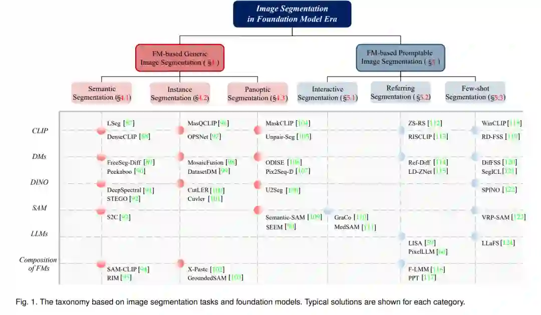 随着基础模型的加速演进,一系列综述已经阐明了LLMs [33]、MLLMs [72]、DMs [85]等的基本原理和开创性工作。然而,这些研究中显然缺少对基础模型在推动图像分割进展方面作用的讨论。与我们的研究最相关的综述是[86],它对与SAM [49]相关的最新发展进行了广泛的回顾。SAM在分割领域做出了开创性贡献,使[86]成为一份宝贵的资源。然而,在基础模型的更广泛背景下,SAM只是众多模型中的一个;因此,[86]的范围在涵盖分割领域的整体进展方面仍然有限。