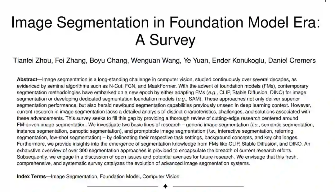 图像分割是计算机视觉领域中一个长期存在的挑战,多年来不断受到研究,经典算法如N-Cut、FCN和MaskFormer就是其中的代表。随着基础模型(Foundation Models, FMs)的兴起,现代分割方法进入了一个新纪元:要么通过适配基础模型(例如CLIP、Stable Diffusion、DINO)用于图像分割,要么开发专门的分割基础模型(如SAM)。这些方法不仅提供了卓越的分割性能,还展示了以往深度学习背景下从未见过的新分割能力。然而,当前的图像分割研究缺乏对这些进展所带来的独特特征、挑战和解决方案的详细分析。本综述旨在填补这一空白,通过对以基础模型驱动的图像分割的前沿研究进行深入回顾,我们探讨了两大基本研究方向——通用图像分割(即语义分割、实例分割、全景分割)和可提示的图像分割(即交互式分割、参考分割、少样本分割)——并详细描述了它们各自的任务设置、背景概念和主要挑战。此外,我们还深入分析了从CLIP、Stable Diffusion和DINO等基础模型中涌现的分割知识。本综述涵盖了300多种分割方法的详尽概述,以全面反映当前的研究努力。最后,我们讨论了未解问题和未来研究的潜在方向。我们希望这篇全新、全面且系统的综述能推动先进图像分割系统的发展。
