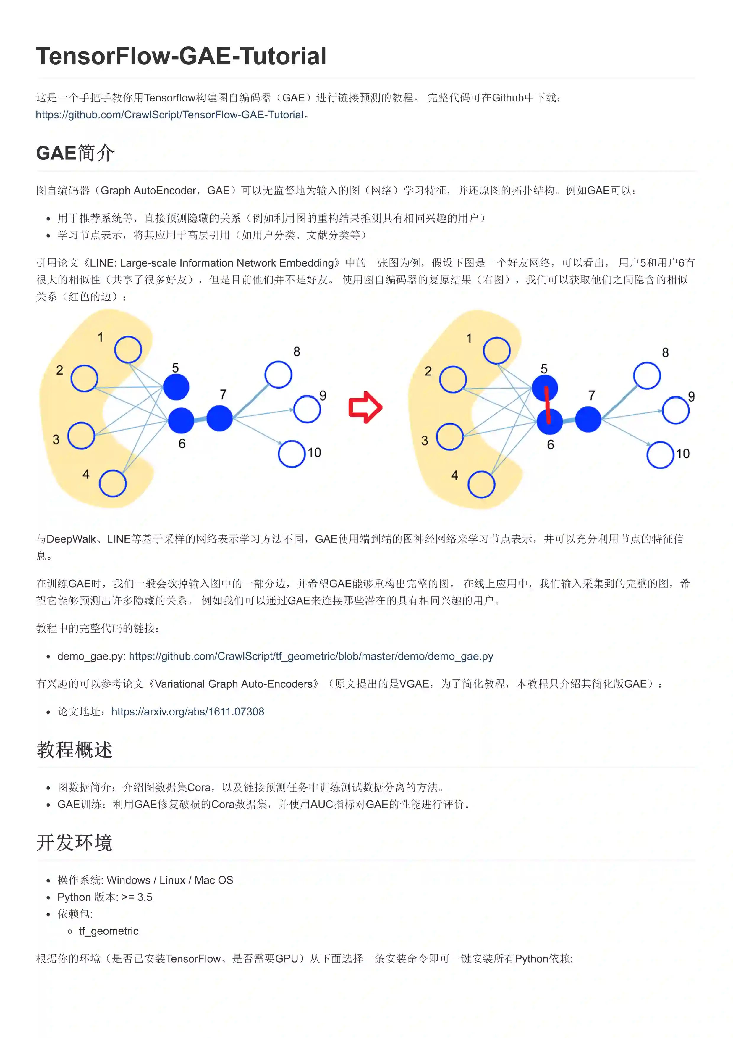 这是一个手把手教你用Tensorflow构建图自编码器(GAE)进行链接预测的教程。 完整代码可在Github中下载:https://github.com/CrawlScript/TensorFlow-GAE-Tutorial。