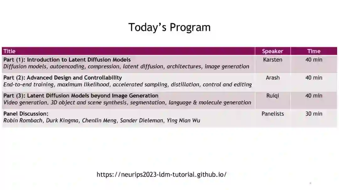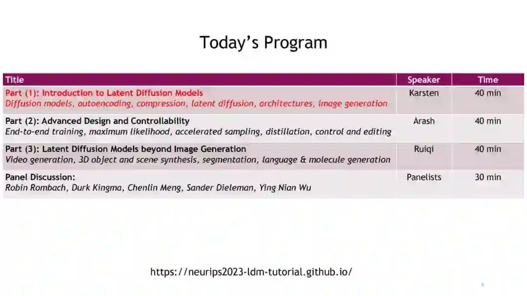 在本教程中,我们旨在提供LDMs的介绍。虽然扩散模型的文献已经很广泛,但LDM范式由于其灵活性以及在性能和计算需求之间的出色权衡而特别突出。我们的目标是呈现一个LDM教程,有助于对高效且灵活但富有表现力的生成模型框架感兴趣的研究者。我们还将强调加速采样和可控性的高级技术,并讨论LDMs在图像合成之外的各种应用。此外,一个小组讨论将提供这一动态领域的多元视角,并为未来对LDMs的研究提供展望。 本教程专注于潜在扩散模型。对于扩散模型的一般教程,我们推荐参考在CVPR'22和CVPR'23上展示的、已录制并公开可用的教程。
