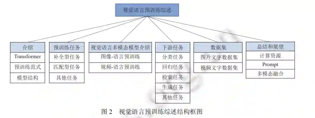 如后文图 2 所示, 本文将围绕视觉语言预训练模型展开介绍, 并通过以下 6 个重要方面详细介绍和讨论视觉 语言预训练模型的最新进展: 首先介绍视觉语言预训练模型的相关知识, 包括 Transformer 框架、模型预训练范式 和视觉语言预训练模型常见网络结构; 其次介绍 3 类模型预训练任务, 通过这些任务, 网络模型可以在无标注的情 况下进行跨模态的语义对齐; 然后我们将从图像-文本预训练和视频-文本预训练两个方面分别来介绍最新的工作 进展; 同时我们也将对预训练模型的下游任务进行分类和介绍; 接着将介绍广泛使用的图像文本和视频文本的多 模态数据集, 并比较和分析了常用预训练模型在不同任务下不同数据集上的性能; 最后对视觉语言预训练进行总 结和展望.