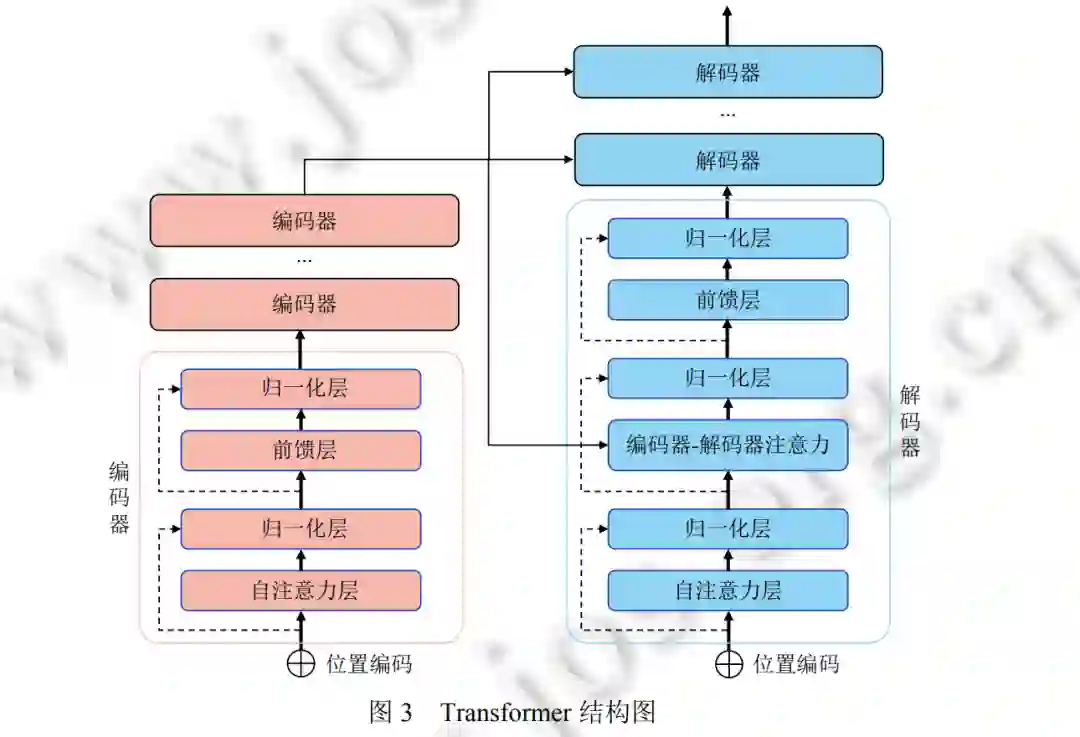 Transformer[2]最早在自然语言处理 (NLP) 领域提出, 并在各种任务上表现出很好的性能. 在此之后, 它也被成 功应用于其他领域, 从语言再到视觉领域. 如图 3 所示, 一个标准的 Transformer 由几个编码器块和解码器块组成. 每个编码器块包含一个自注意 (self-attention[2] ) 层和一个前馈 (feed forward) 层. 不同于编码器块, 每个解码器块除 了自注意力层和前馈层外, 还包含一个编解码注意力层。