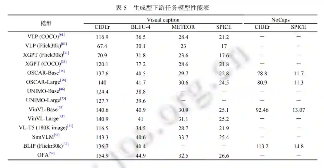 视觉描述 (visual captioning, VC). VC 旨在为给定的视觉 (图像或视频) 输入生成语义和句法上合适的文本描 述. 大规模新物体描述 (novel object captioning at scale, NoCaps): NoCaps[74]扩展了 VC 任务, 以测试模型描述来自 Open Images 数据集的新物体的能力, 这些物体都未曾在训练语料库中出现过. 视觉对话 (visual dialogue, VD): 常见视觉语言预训练模型对应生成型下游任务如表 5 所示, 包括视觉描述和大规模新物体描述. 其中, CIDEr、BLEU-4、METEOR、SPICE 为 4 个评价生成语句的指标.