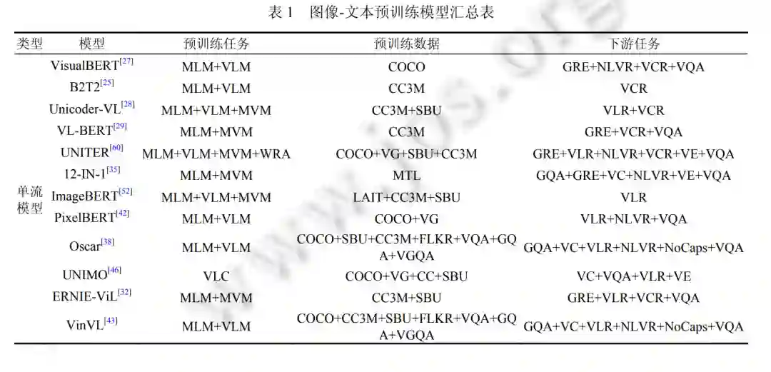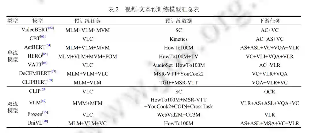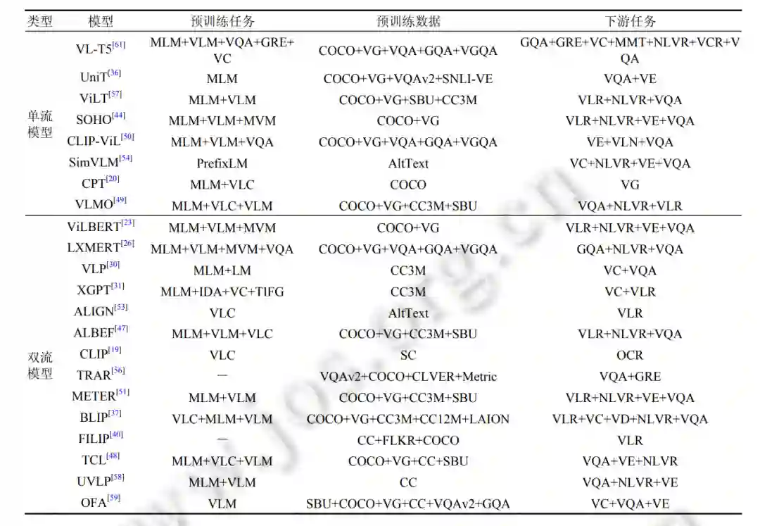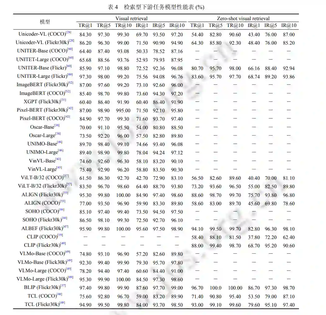 视觉-语言检索 (vision-language retrieval, VLR). VLR 涉及对视觉 (图像或视频) 和语言的理解, 以及适当的匹 配策略. 它包括两个子任务: 从视觉到文本和从文本到视觉的检索, 其中视觉到文本检索是根据视觉从更大的描述库中获取最重要的相关文本描述, 反之亦然. 常见视觉语言预训练模型对应检索型下游任务如表 4 所示, 包括视觉语言检索和零样本 (zero-shot) 的视觉-语言检索。