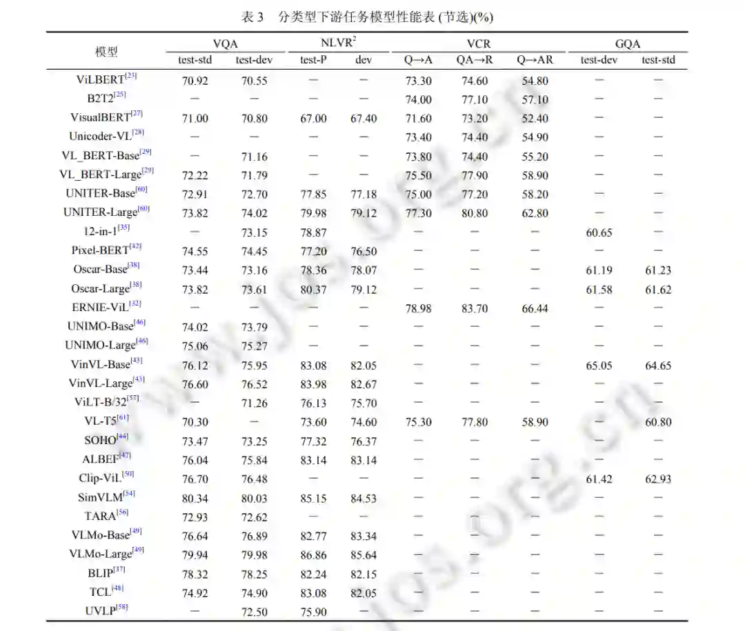 多样化的任务需要视觉和语言的融合知识. 在本节中, 我们将介绍此类任务的基本细节和目标, 并将其分为 4 类: 分类、检索、生成和其他任务. 常见视觉语言预训练模型 对应分类型下游任务如表 3 所示, 包括视觉问答 (VQA), 自然语言视觉推理 (NLVR), 视觉常识推理 (VCR) 和视觉 推理和组合式问答 (GQA), 由于视觉语言预训练任务所包含的下游任务繁多, 表 3 中仅节选出最为常见的下游任 务进行性能的统计与比较.