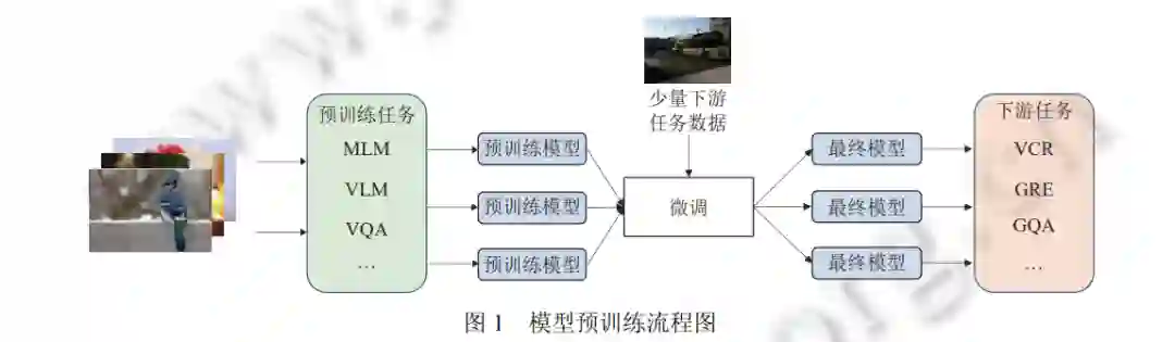 机器学习的目标是让机器像人一样感受世界和理解世界. 正如人的感官能去感知一样, 多模态机器学习旨在 处理和理解不同模态 (诸如视觉、语言、听觉等) 交织融合的信息. 从过去到现在, 研究者们已经做出了很多单模 态学习的工作, 诸如人脸识别、目标检测等, 并从科学研究扩展到产业落地, 最后服务于生活. 但是随着深度学习 技术的发展, 多模态学习慢慢展现出其重要性和必要性[1] . 作为人类生活中最重要的文化载体, 视觉和语言在多模 态学习领域承载着十分重要的一部分, 在近几年里, 视觉语言多模态学习也得到了广泛地关注和飞速地发展. 通 常, 参数较大的模型往往需要大量的标注数据来进行训练, 但由于多模态标注技术、标注成本等一系列因素的制 约, 高质量的标签数据始终比较缺乏, 这也给模型的性能提升带来了瓶颈. 2017 年美国谷歌公司研究人员提出 Transformer[2]的基础框架, 用于解决这个问题. Transformer 模型首先通过 自监督学习进行预训练, 通过一系列的任务来从大规模的无标注数据中挖掘监督信息以训练模型, 从而来学习数 据的一般化表征. 然后对于不同的下游任务只需要采用少量的人工标注的数据进行微调就能达到优异的效果, 预 训练流程见图 1 所示. 在自然语言处理 (NLP) 领域中, BERT[3]的出现后, 各种预训练任务便如雨后春笋般涌现出 来, 诸如 GPT[4]系列, MASS[5]等. 不仅仅局限在 NLP 领域, 计算机视觉 (CV) 领域中也出现了许多杰出的预训练方 法, 比如 ViT[6]等. 与此同时, 模型预训练技术也在多模态领域得到了研究人员越来越多的关注, 特别是在视觉-语 言联合表征学习方面, 预训练模型在各种下游任务上都取得了优异的性能.