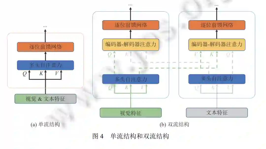 在本节中, 我们从两个不同的角度介绍视觉语言预训练模型的体系结构: (1) 从多模态融合的角度对比单流结 构与双流结构. (2) 从整体架构设计的角度对比仅编码结构和编码-解码结构.