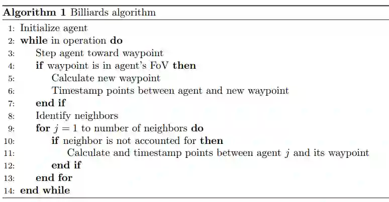 本工作评估了一种称为台球算法(billiards algorithm)的动态传感器覆盖(DSC)算法。研究了避开障碍物和无意义区域(如森林或湖泊)的不同方法。避障对于 DSC 算法的多功能性至关重要,因为它使无人机能够在障碍物密集的环境中导航,同时最大限度地降低碰撞风险。在 MATLAB 中进行仿真,以评估算法在平均延迟和最差延迟方面的性能。将台球算法与随机路径选择和文献中的一种算法(称为 Ganganath 算法)进行了比较。为了提高台球算法在障碍物密集环境中的性能,实施了模型预测控制(MPC),期望智能体(agent)能通过规划更长远未来而受益。本文中展示的结果表明,避障台球算法在平均延迟方面与 Ganganath 算法相比表现良好,但在最差延迟方面存在不足。在某些室内环境中,Ganganath 算法表现出局限性,而台球算法在两项性能标准上都优于它。在计算复杂性和通信流量方面,这些算法差异显著。台球算法的仿真时间和通信量都低得多,这是军事无人机集群算法中非常有价值的两个额外指标。MPC 在一个有限的未来时间窗口上优化决策,被集成到台球算法中以评估其有效性。研究发现,MPC 在一般障碍物密集的环境中并不能提高性能。这很可能是由于在多智能体系统中预测未来状态的固有困难,再加上智能体即使没有 MPC 提供的预见能力,已经能够高效地探索未探测区域。然而,在某些环境下,MPC 可以为算法带来显著的性能提升。