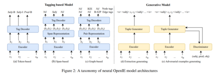 生成模型将OpenIE定义为一个序列生成问题,它读取一个句子并输出一系列的提取。图2(d)给出了生成序列的示例。形式上,给定一个令牌序列S和期望的提取序列Y = (y1, y2,…, ym),模型使条件概率Q P(Y |S) = IIp(yi |y1, y2, . . . , yi−1; S); 也有生成对抗性元组的工作,目的是使分类器难以将它们与真实元组区分开来。