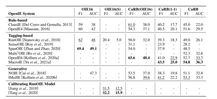 神经OpenIE系统在两个流行的基准OIE2016和CaRB上的性能,每个都有多个部分匹配策略。每个评估设置下的最佳结果(基于可用的分数)以黑体显示,次佳的结果以下划线显示。文献中缺失的结果标记为“-”。由于logcian仅在中国基准上进行评估,而Adversarial-OIE仅在OIE2016上给出了precision-recall曲线,没有AUC评分,因此这两个系统不在这里列出。为了全面起见,我们还包括了两种流行的基于规则的系统,即ClausIE和OpenIE4。