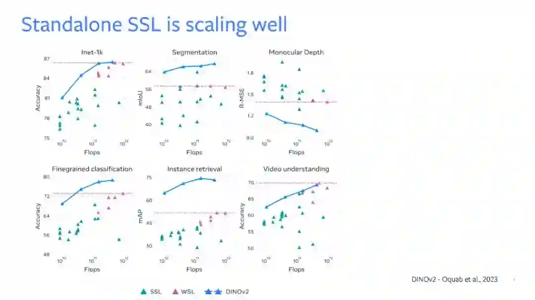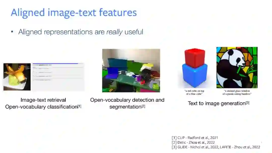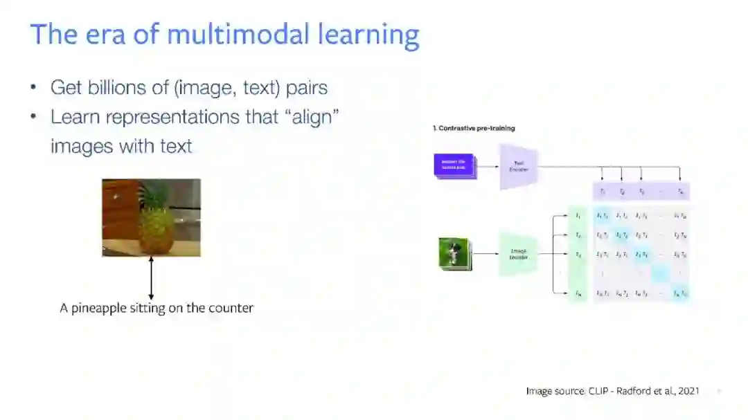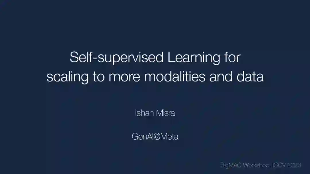 在本次演讲中,我将展示如何利用自监督学习来改进基础的多模态模型,使其能够扩展到更多的模态、学习到更好的表示,并提高其效率。训练基础多模态模型时的一个大挑战是配对数据的稀缺性。虽然我们有大量的(图像,文本)数据,但其他模态,如深度或IMU的数据集整体上则是有限的。我们在这方面的首次尝试名为ImageBind,它展示了图像可以用作一个通用的信号来“绑定”多种不同的模态。我们证明了自然出现的图像配对,如(图像,IMU),(图像,深度)可以被自动用来学习一个共享的嵌入空间,其中未见过的模态对是对齐的。ImageBind实现了零射击识别、跨模态检索和生成的新能力。我们的第二项工作显示,使用自监督学习作为“预”预训练阶段可以改进多模态(图像,文本)表示,在各种模型大小和数据大小上都有所表现。预预训练提高了数十亿参数在数十亿图像上训练的基础模型的性能,同时也加速了它们的收敛。由此产生的模型在完全微调、线性探测、图像和视频领域的零射击识别任务上都展现出了最先进的性能。