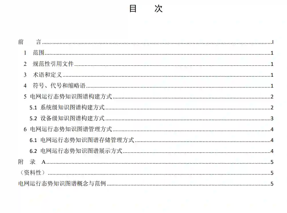 本文件规定了电网运行态势知识图谱智能构建与管理的总体要求,包括电网运行态势知识图谱定义、 电网运行态势知识图谱构建方式以及管理方式。 本文件适用于电网运行态势知识图谱智能构建与管理标准,用于支撑电网智能调控系统的研制、开 发和测试。电网运行态势知识图谱是指使用图模型描述电网稳定态势知识与电网物理设备之间的关联关系,实 现电网稳定态势知识的直观表达。电网运行态势知识图谱可根据用户的关注程度分为系统级知识图谱与 设备级知识图谱,实现了电网运行态势知识的分层管理,帮助使用用户直观了解电网的运行态势。