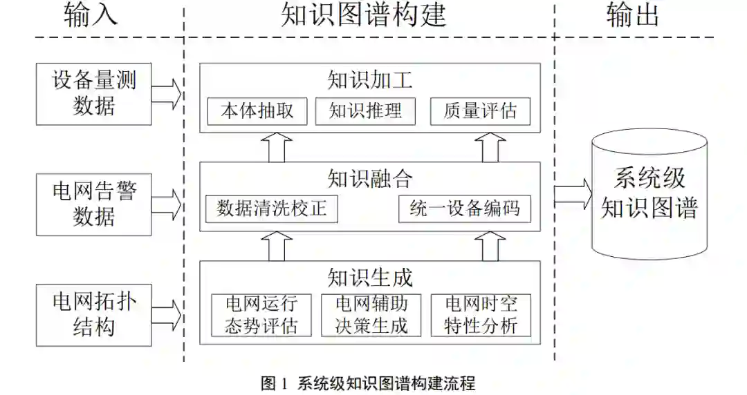 系统级知识图谱构建流程如图 1 所示,包括但不限于: (1)知识生成: 1)基于电网量测数据,利用电网机理与机器学习算法,包括但不限于强化学习、图卷积神经网络、 随机森林等方法开展电网运行态势指标计算,生成静态评估指标与暂态评估指标;基于输入数据与 静态评估、暂态评估指标,生成切机、切负荷等电网辅助控制策略;基于输入数据,利用数据挖掘 算法,包括但不限于线性回归、贝叶斯网络、循环神经网络等方法开展电网时空特性分析,生成电 网时空轨迹聚类、相似性、相关性、趋势预测分析结果; 2)基于电网仿真计算,开展电网运行态势指标计算,计算电压安全指标、功角安全指标; (2)知识融合:对知识生成步骤中输出的电网评估指标、控制策略等信息进行数据清洗校正并统 一设备编码,实现知识融合; (3)知识加工:对融合后的知识进行本体抽取,抽取出发电机、母线等物理实体,各类静态评估 与暂态评估指标、扰动控制策略、时空关联特性等虚拟数字实体以及拓扑连接关系等,结合知识图谱概 念模型生成初步的系统级知识图谱;利用机器学习算法,挖掘知识图谱中实体之间新的关联关系,并对 知识的质量进行评估,舍弃质量较低的知识。