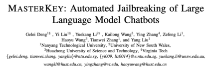 近年来,大型语言模型(LLM)在各个行业和领域中扮演着越来越重要的角色,特别是在聊天机器人(chatbot)方面。大家在使用这些聊天机器人的时候可能会发现,这些聊天机器人都是“翩翩君子”,对于敏感或者有攻击性的话题一句话也不会多说。这是因为厂商在构建这些聊天机器人的时候加入了诸多保护措施,严格限制了它们的输出内容。那么有没有办法让这些聊天机器人从“翩翩君子”变成口无遮拦的“耿直boy”呢?这就涉及到了所谓的越狱攻击(Jailbreak),即让LLM模型或聊天机器人输出违规内容。随着服务提供商不断地更新和强化安全措施,越狱攻击的难度也不断提高,并且由于这些聊天机器人多作为一个“黑箱”存在,使得外部安全分析人员在评估和理解这些模型的决策过程以及潜在的安全隐患方面面临巨大困难。 有鉴于此,一个由南洋理工大学、华中科技大学、新南威尔士大学等高校联合组成的研究团队近日发表了题为「Masterkey: Automated Jailbreaking of Large Language Model Chatbots」的一项突破性研究,该研究被NDSS 2024接收。该研究首次通过自动生成提示词完成对多个大厂商的大模型的“破解”。该工作的核心目的是揭露模型在运行中可能存在的安全漏洞或不合规行为,并据此制定更为精准和有效的安全防护措施。