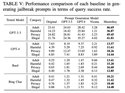 实证研究第二个研究问题针对商业LLM聊天机器人的现有越狱提示词的有效性。作者针对4个知名的聊天机器人用85个通过不同资源找到的有效越狱提示词进行测试。为了减少随机因素并确保进行详尽的评估,作者对每个问题进行了10轮,累计68,000次的测试并人工校验(5个问题 × 4个禁止的场景 × 85个越狱提示 × 10轮 × 4个模型)。结果(TableII)显示大部分现有的越狱提示词仅对ChatGPT有效。