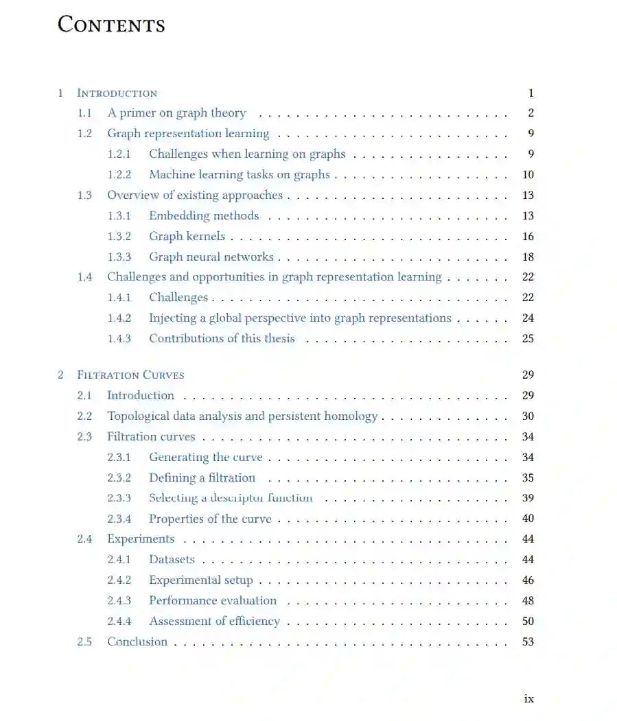 本论文探讨了全局信息在生成有意义的图表示中的作用,这些图表示不受邻域聚合问题的影响。我们并不寻求取代现今强大的邻域聚合方法,而是研究全局信息如何补充或提供图中局部信息的替代视角。 本论文的第一个贡献是介绍一种将图表示为高维曲线的新颖方式,我们称之为过滤曲线。过滤曲线是一种通过在多个尺度上捕捉信息来生成图的全局表示的有效方法,可以完全无参数。基于曲线的表示还带来了其他好处,比如直接创建图的向量表示的方法,使其可以与标准的机器学习算法一起使用。除了其效率和易用性之外,我们发现我们最简单的过滤曲线形式已经达到了与更复杂、高度参数化的最新竞争方法竞争的实证性能,这证明了全局图表示的价值。