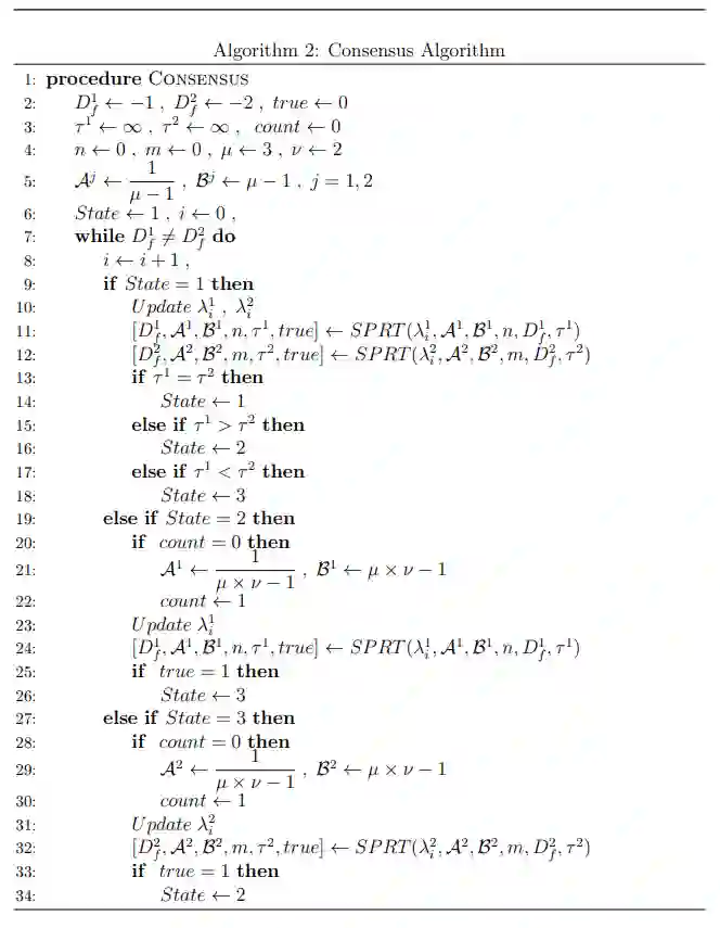 本文考虑了使用两个观测器从观测数据中检测马尔可夫模型和高斯模型的问题。考虑两个马尔可夫链和两个观察者。每个观察者观察真实未知马尔可夫链状态的不同函数。给定观察结果后,目标是找出两个马尔可夫链中哪一个产生了观察结果。本文为每个观察者提出了块二元假设检验问题,并证明每个观察者的决策是局部似然比的函数。本文提出了一种共识方案,让观察者就其信念达成一致,并证明了共识决策对真实假设的渐近收敛性。使用两个观测者检测高斯模型时,也考虑了类似的问题框架。为每个观测者提出了序列假设检验问题,并使用局部似然比求解。考虑到观察者随机和不对称的停止时间,提出了一种共识方案。本文引入了 “信息价值 ”的概念,以理解为达成共识而交换的信息的 “有用性”。