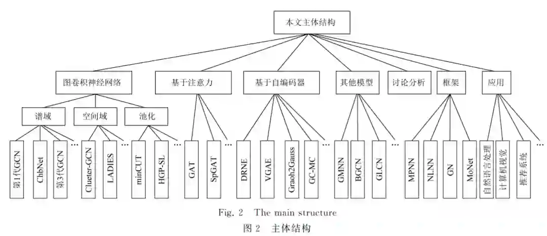 近期已有一些学者对图神经网络及其图卷积神经网络分支进行了综述[16G19].本文的不同之处在于,首先由于经典模型是很多变体模型的基石,所以给 出了经典模型的理论基础以及详细推理步骤.在1.2 节基于空间方法的图卷积神经网络中,多用图的形 式列出模型的实现过程,使模型更加通俗易懂.文献 [16G19]并未对目前广大学者热点讨论的问题进行 总结,所以在第5节针对图神经网络的讨论部分,首 次列出了目前研究学者对 GNN 的热点关注问题, 比如其表达能力、过平滑问题等.然后,在第6节中 总结了图神经网络新框架.同时,针对图神经网络的 应用,在第7节中较全面地介绍了 GNN 的应用场 景.最后,列出了图神经网络未来的研究方向.在图2 中列出了本文的主体结构.