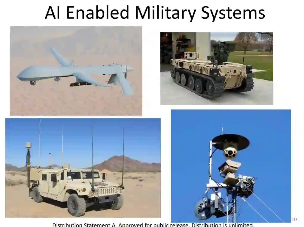 人工智能在军事中可用于多项任务,例如目标识别、大数据处理、作战系统、网络安全、后勤运输、战争医疗、威胁和安全监测以及战斗模拟和训练。