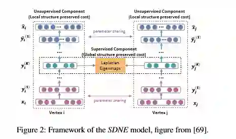 network embedding,是为网络中的节点学习出一个低维表示的方法。目的在于在低维中保持高度非线性的网络结构特征,但现有方法多采用浅层网络不足以挖掘高度非线性,或同时保留局部和全局结构特征。本文提出一种结构化深度网络嵌入方法,叫SDNE该方法用半监督的深度模型来捕捉高度非线性结构,通过结合一阶相似性(监督)和二阶相似性(非监督)来保留局部和全局特征。