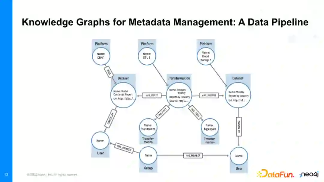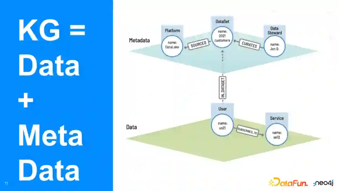 第二个案例是关于知识图谱在元数据管理中的应用。元数据不仅包含数据本身的信息,还包括了如数据集的来源、数据源所在平台等上层信息。所以,元数据信息相当于为数据加上额外一层血缘关系,是“数据的数据”。当我们想要将数据展示给潜在数据消费者,如一个团队的新成员时,那么元数据这类包含数据类型、数据最近版本的信息就变得极为重要。