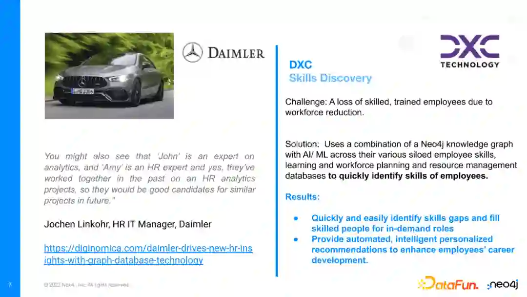 很多著名分析家,如Gardner强调了技能发现的重要性。他指出超过53%的公司“技能发现”的短板阻碍了业务转型,因为他们无法识别新业务中员工所必需的技能,从而无法有效利用公司中的人力资源。Neo4j曾经与DAIMLER合作,使用知识图谱成功地将技能发现运用于公司员工中。具体地,他们想要找到公司在哪些技能方向上缺少足够的优质员工,并试图在公司内部找到最能胜任那些空缺职位的员工。此外,他们还想要为公司员工制定一套最佳的职业规划路线,使得员工可以最大化地激发自己的潜能并合理地运用自身所含技能。