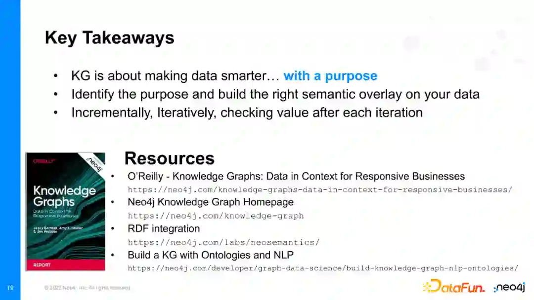 最后,我对今天的分享进行总结。 首先,知识图谱可以使得我们的数据根据我们的下游应用变得更加“聪明”,进而使得数据和应用的联系更加紧密。它可以根据我们使用数据的目的来构建合适的、包含语义信息和知识信息的图结构,覆盖在原有数据之上。应用知识图谱的最佳实践是:找到自己应用数据的目的,构建正确的语义知识图谱,从小型图谱开始逐渐扩大图的规模。 总而言之,由于GraphQL只是一个数据接口语言,它无法进行复杂的图查询,因此Cypher更适用于图遍历和复杂图查询的场景(它和图数据库结合得更紧密),而GraphQL适用于存取数据。
