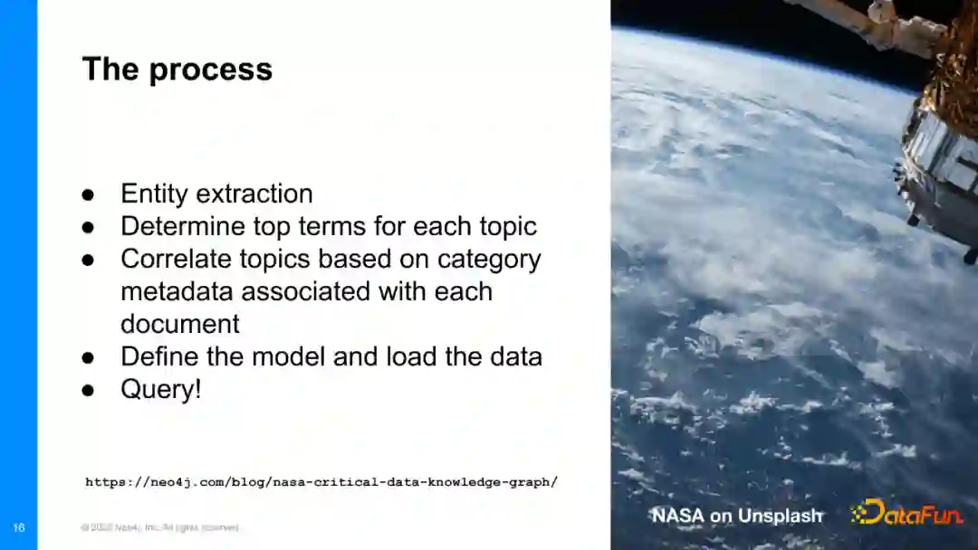 **NASA的解决方案是利用知识图谱与自然语言处理技术来处理这些海量文档。**首先,自然语言处理中的实体抽取任务可以将实体表示为知识图谱上一个显式的图节点。当我们建模文档中的所有实体,并结合元数据信息以及领域先验知识如领域分类信息、领域知识表达等,我们可以将实体节点按照自己的范式进行连接,构成一张包含丰富领域知识的图谱,进而使得我们可以从一个节点游走到另一个节点,从语义层面回答query。