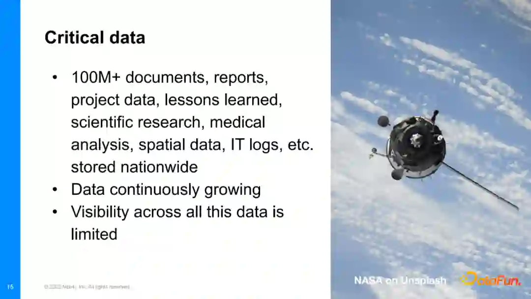 **最后,我来介绍一下知识图谱领域最被广泛使用的应用:基于知识图谱的语义搜索。**很久之前,我们在网站进行搜索时,我们只是寻找与query匹配的关键词所在的文章或网页。现在,我们要求搜索引擎可以理解query的语义信息。 之前NASA也遇到了这类问题,因为它们的数据库中包含海量的文档、报告、项目数据、经验教训、研究成果等。之前,NASA的搜索方式使用关键词匹配,而这类忽略上下文信息与语义信息的搜索方法十分低效。