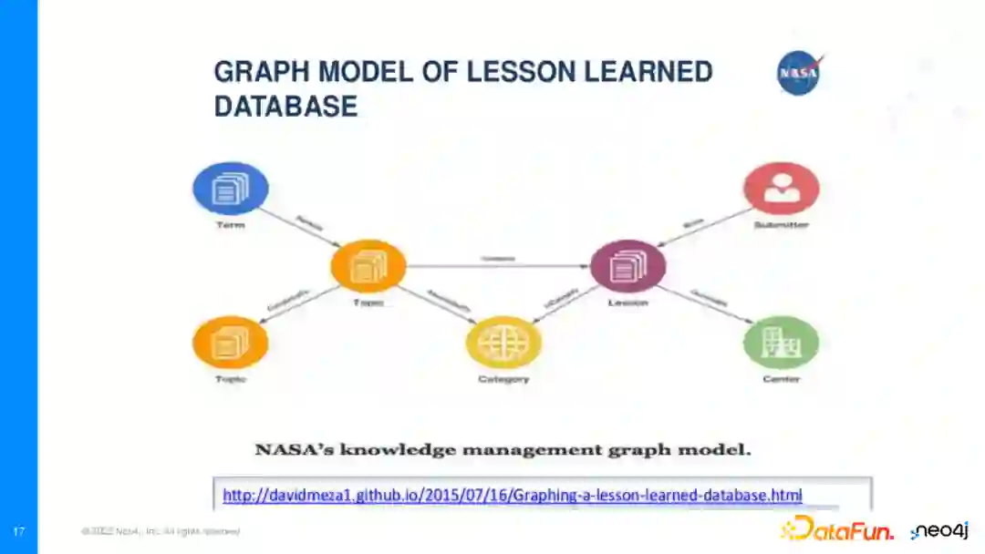 具体地,NASA不仅将经验教训、文档、URL等映射为知识图谱上的节点,还使用表示学习将文档的主题、实体词建模并映射至知识图谱中,并将它们与对应的文档相连。通过这一做法,query查询可以充分利用语义相关信息,使得搜索更加高效。