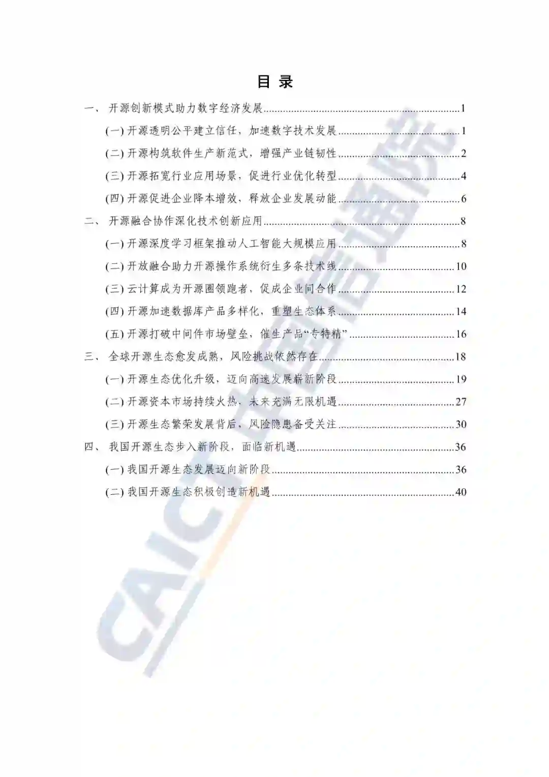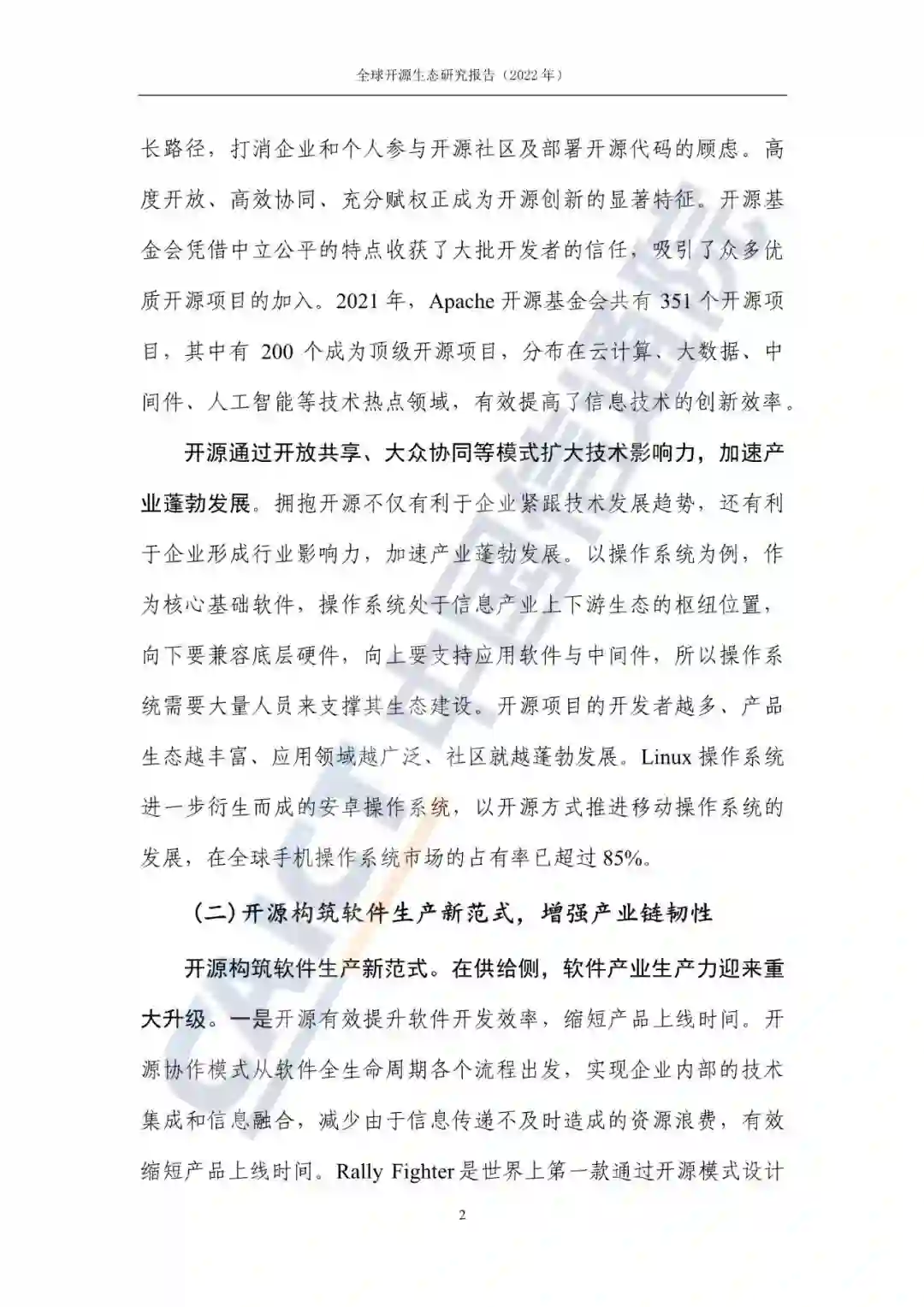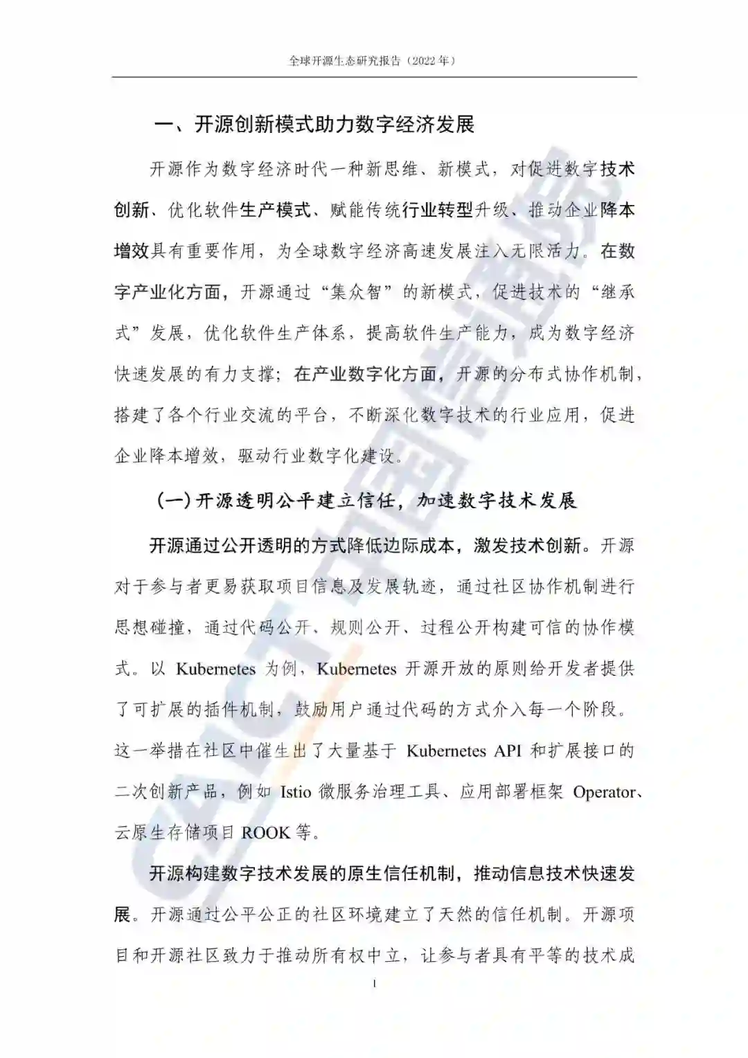 报告核心观点;**1. 开源创新模式全面助力数字经济发展。**开源作为数字经济时代一种新思维、新模式,对促进数字技术创新、优化软件生产模式、赋能传统行业转型升级、推动企业降本增效具有重要作用,为全球数字经济高速发展注入无限活力。在数字产业化方面,开源通过“集众智”的新模式,促进技术的“继承式”发展,优化软件生产体系,提高软件生产能力,成为数字经济快速发展的有力支撑;在产业数字化方面,开源的分布式协作机制,搭建了各个行业交流的平台,不断深化数字技术的行业应用,促进企业降本增效,驱动行业数字化建设。