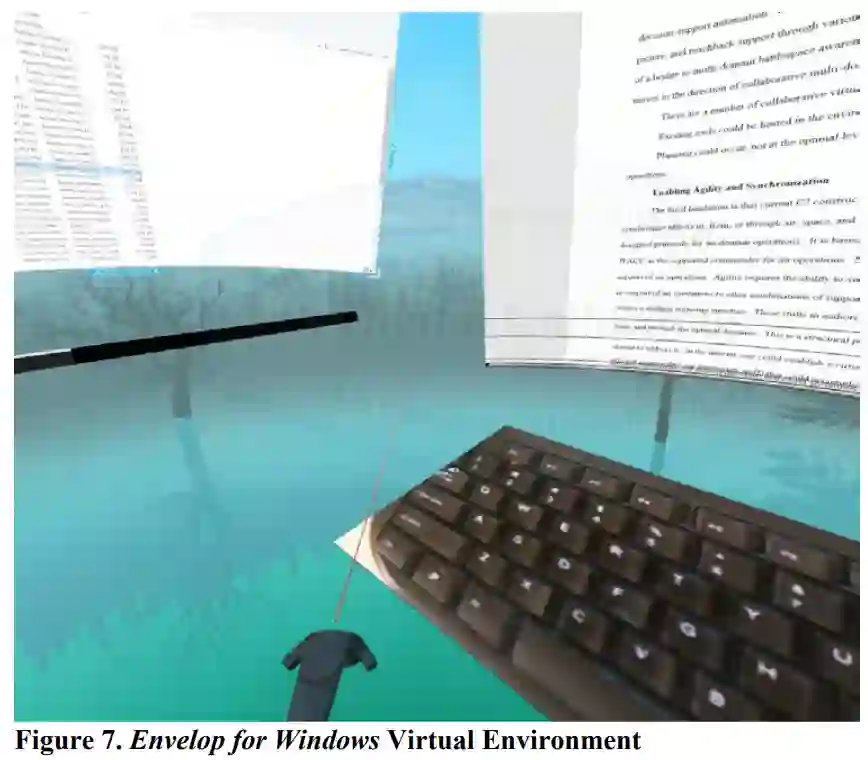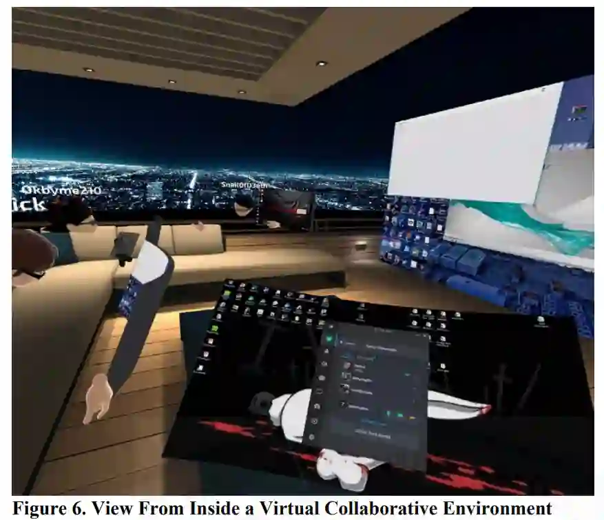 有许多协作式虚拟环境可供使用。图 6 显示了一个典型商业产品的内部视图。在 Bigscreen 这个特定的环境中,每个人的个人屏幕上都会显示其所在物理位置显示器上的内容。在这个空间内,他们可以查看彼此的屏幕,将一个屏幕作为大显示屏推送到公共空间,进行交谈,并共享音频和视频馈送。这种特殊应用的优势在于,它允许用户在自己的电脑上运行他们通常会运行的任何功能。在联合规划场景中,每个人可能会运行不同的 GCCS 应用程序,以支持他们在团队中的特定角色。空间中的其他人可以观察、评论和批判产品,也可以像在 AOC 中一样通过自己的物理计算机访问产品。通过头部和手部追踪,一些社交线索(如指向和聚焦)会增加临场感。其他环境或多或少都具有沉浸感和互动性。BasementVR是一个共享环境,允许交互式创作二维和三维艺术作品,可用作三维协作白板。AltSpace 是一个协作世界,化身可在用户创建的空间中进行互动。当访问大型工作空间比互动存在更重要时,Envelop 允许用户将其桌面扩展为 360 度虚拟空间。它还允许用户将现实世界带入虚拟空间,这样用户就可以看到自己的键盘或物理桌面等。聊天和语音聊天应用程序可以提供任何所需的通信互动。图 7 显示了该环境的一个快照。随着虚拟现实系统的不断普及,更新、更好的应用也将应运而生。