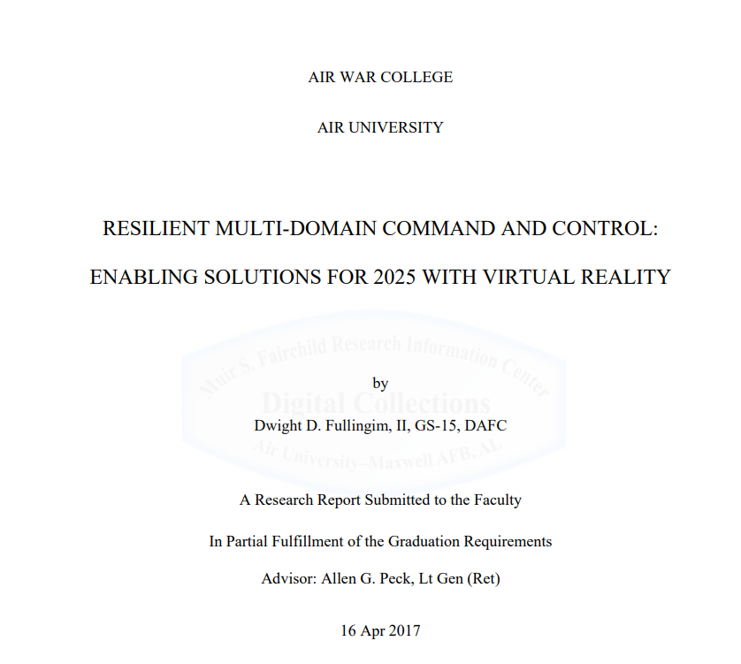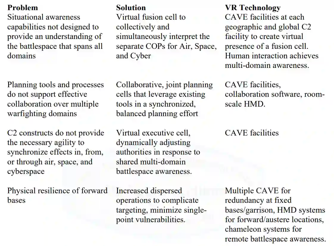 如前所述,MDC2 的作战概念有三个限制。首先,当前的态势感知能力无法同时提供对多个领域的了解。其次,当前的规划工具不支持在多个作战领域进行有效协作。最后,当前的指挥与控制概念不支持敏捷性,因为它们无法同步在空中、太空和网络空间中或通过空中、太空和网络空间产生影响。如 AFFOC 所述,MDOC 是将这些功能纳入未来指挥与控制中心结构的一种尝试。在 MDOC 的开发过程中,虚拟现实技术可用于缓解这些限制,并使 AOC 的能力更接近 MDOC 所需的能力。