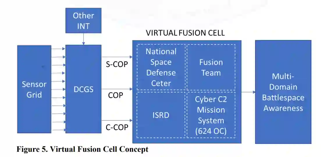 实现多域作战空间感知的一种可能性是建立虚拟融合单元。这将包括地理 AOC 与空间和网络全球作战中心之间的分布式协作。每个实体都将向融合小组提供自己的作战画面。虚拟参与者将能够检查所有三张图片,并合作开发作战空间感知。如图 5 所示。每个地点都有一个 CAVE,作为连接虚拟空间的物理点。来自 AOC 各部门的指定成员可以看到多域画面,并相互协作提示跨域威胁和机遇。虽然这还不是真正融合的多域作战画面,但它将为未来的这种能力架起一座桥梁。移动式和便携式 CAVE 可通过商业途径获得,因此这种能力也可用于通过分散 AOC 的行动来增强现有 AOC 的复原力。