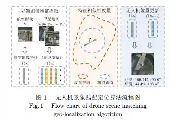 摘 要 无人机因其高度的灵活性, 在临地安防、灾后救援、地质勘测、农业植保等领域发挥着重要作用, 因此受到越来越 多的关注. 定位导航作为无人机中的关键技术, 对于无人机能否顺利执行任务至关重要. 当前主要的定位导航算法包括全球 导航卫星系统、惯性定位以及景象匹配定位导航等. 首先, 景象匹配定位导航方法利用计算机视觉技术, 对无人机飞行时采 集的航空影像进行数字化特征编码; 随后, 通过构建相似性度量与检索模型, 将航空影像特征与预先获取的遥感地图库特征 进行相似性度量, 从而完成景象匹配; 最后, 根据无人机航空影像与遥感卫星地图的匹配结果, 获取相应的地理位置信息, 并将其更新为无人机的定位结果. 景象匹配定位导航方法摆脱了定位系统对定位信号的依赖, 实现了无人机飞行定位的自 主化. 鉴于此, 以景象匹配算法中的特征提取方式为线索, 分别针对基于模板匹配、基于手工特征以及基于度量学习的景象 匹配, 梳理其发展过程, 并总结景象匹配定位导航方法中的关键问题. 最后, 针对景象匹配算法的发展现状, 总结无人机景 象匹配定位方法中亟待解决的问题.