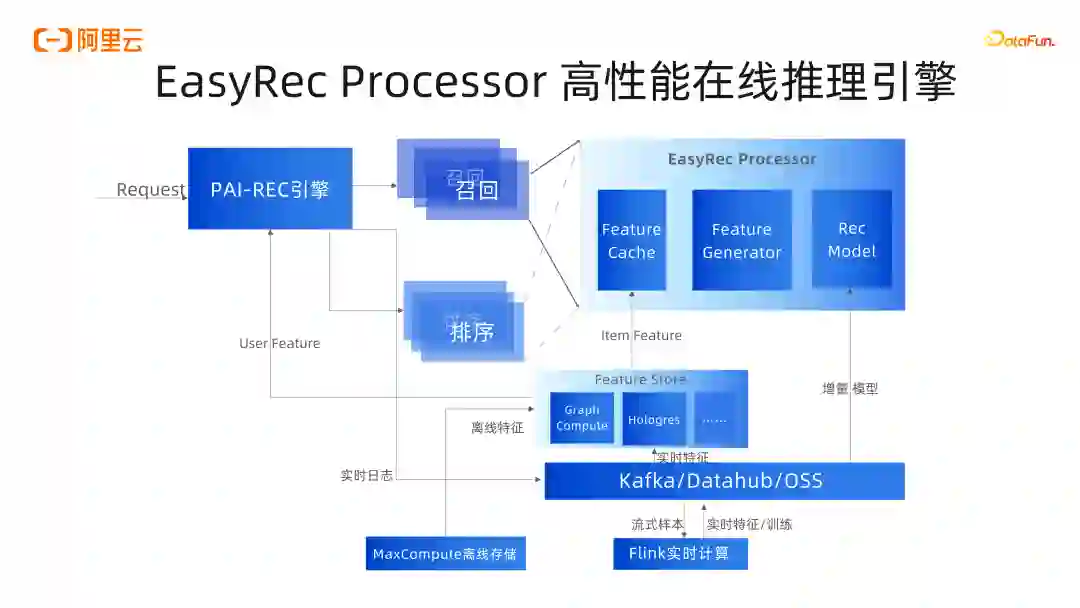 这是整个推理引擎的数据链路或架构图。重点在于右侧的推理链路,包括 Feature Cache 和 Feature Generator。①Feature Cache:处理离线和实时特征,缓存后进行更新和分级存储。由于 embedding 达到百 GB 甚至 TB 级别,完全放在内存中不可行,因此需要多级缓存。②Feature Generator:在获取特征后,利用 Feature Generator 进行共享和计算,最后交给模型处理。最下面的图示,展示了实时特征和离线特征的计算过程,以及增量模型的更新方式。