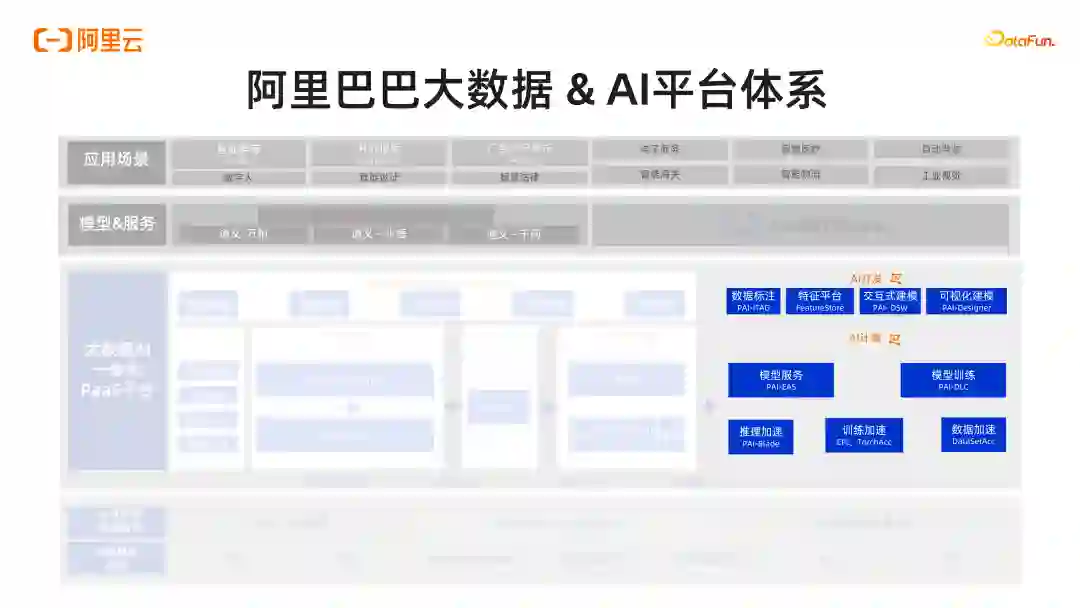 在大数据平台进行数据处理后,通过 AI 平台提供多种功能。AI 平台主要包括数据标注(PAI-iTAG)、数据清洗、特征平台(FeatureStore)等。有了这些数据后,可以进行代码开发,包括交互式开发(PAI-DSW)和可视化开发(PAI-Designer)。开发好的代码需要在数百台服务器上进行分布式训练,因此有模型训练(PAI-DLC)模块。为了提高训练效率,提供数据集加速(DataSetAcc)、网络通信优化、算子优化和硬件并行加速等功能。训练完成后,通过 PAI-EAS 平台提供模型服务。这就是我们大数据和 AI 的 PaaS 层能力。