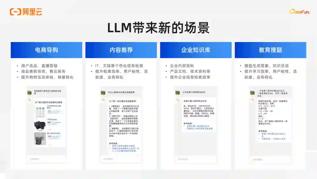 接下来介绍我们在与合作伙伴合作中,发现的搜索推荐领域一些大语言模型带来的新场景。①电商导购,传统 query 方式无法精准输出结果,而大语言模型能助力用户选品、直播答疑,提供商品售前咨询和售后服务。②内容推荐,如用户想购买特定商品或解决某个问题,大语言模型可以给出内容推荐。③企业知识库,每家企业都有内部文档库,新员工可通过 AI 机器人快速学习公司内部知识,而不必依赖老员工手把手指导。④教育搜题,大语言模型在教育领域也有应用,如搜题生成答案和知识总结。这些都是客户在尝试的一些 LLM 新场景。