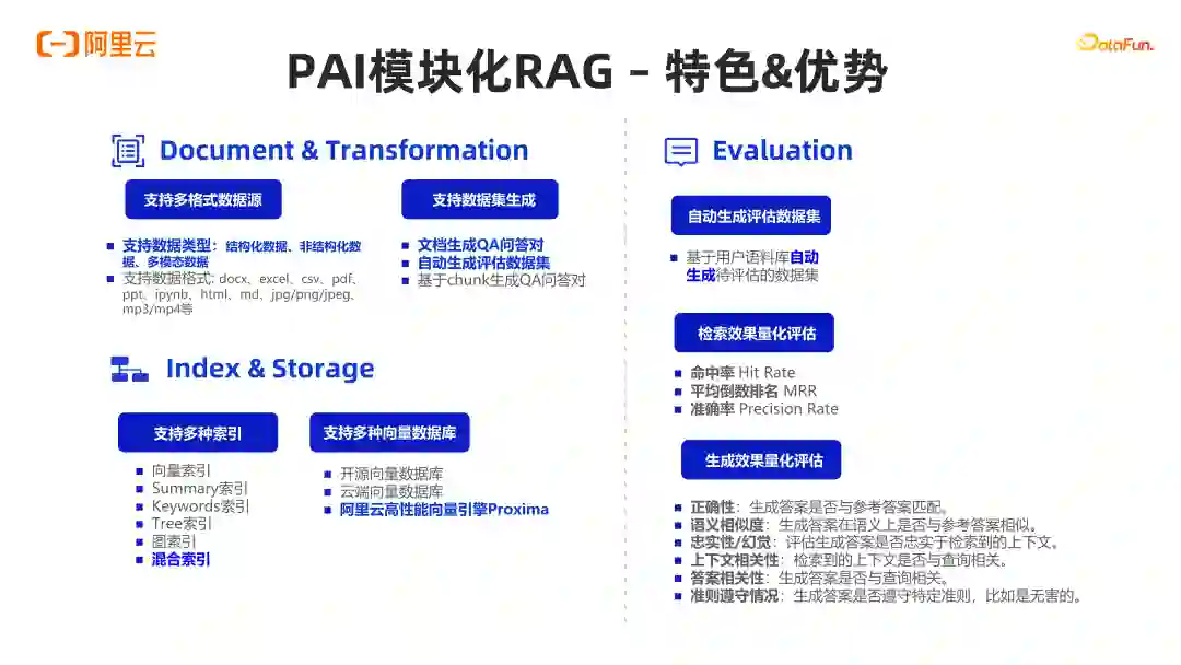 PAI-RAG 主要支持的数据类型包括多模态数据、文档的结构化表示、embedding 模型的优化等。我们集成了 OCR 功能,并考虑了文档的层级结构,支持 PDF 和 Word 等多模态的文件,包括文件中的截图。当 Embedding 模型效果不佳时,使用第三方的大模型来丰富知识库,自动生成文档扩充此功能。使用类似的思想来生成评估集,这对于构建 RAG 链路的企业来说非常有用。它们通常有很多文档,但没有准备很多问题来测试 RAG 的效果。我们使用大模型 RefGPT(不是我们独创)生成评估集。此外,还支持关键字检索和混合检索。我们的工作还包括①评估大语言模型的优劣,比如把人工评估的工作交给另一个大模型;②支持各种量化指标,如命中率、准确率等;③在回答的质量上,考虑了正确性、语义相似度、忠实性、答案的上下文相关性等多个维度。